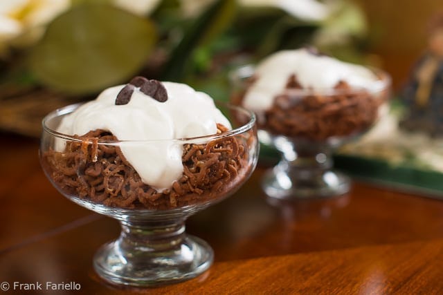 Named after the highest peak of the Alps straddling the border between France and Italy, Montebianco is simply a mound of puréed chestnut perfumed with cocoa and other flavorings and topped with whipped cream, a veritable mountain of sweet deliciousness. And it’s rather easy to make once you’ve prepared the chestnuts, so if you buy prepared chestnuts at the supermarket, you can whip this up in no time.
